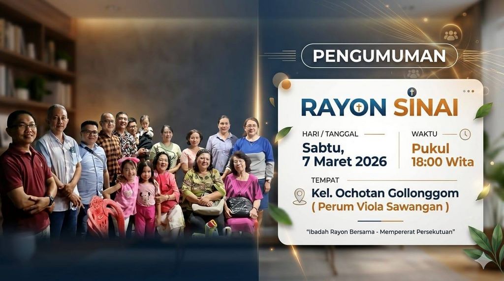 Puji syukur kami panjatkan kepada Tuhan Yesus Kristus karena oleh kasih dan penyertaan-Nya, Ibadah Rayon Sinai yang dilaksanakan di rumah Kel. Ochotan Golonggom (Perum. Viola Sawangan) pada pukul 18.00 WITA boleh terlaksana dengan baik, penuh sukacita, dan dalam suasana kebersamaan yang diberkati Tuhan.